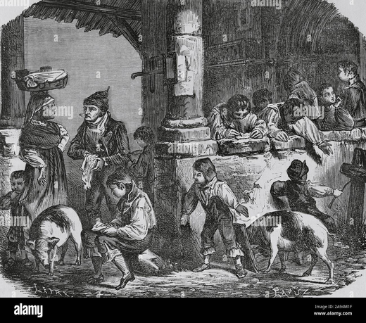 España. Galicia. Escuela en el atrio de una iglesia de Galicia. Dibujo por Letre. Grabado por Tomás Carlos Capuz (1834-1899). Crónica General de España, Historia Ilustrada y Descriptiva de sus Provincias