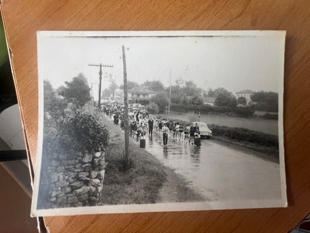 Imágenes cedidas por la AAVV San Julián de Roces. Superior centro: Procesión por la carretera Carbonera; al fondo, a la derecha, la escuela y en el centro Bar la Parra